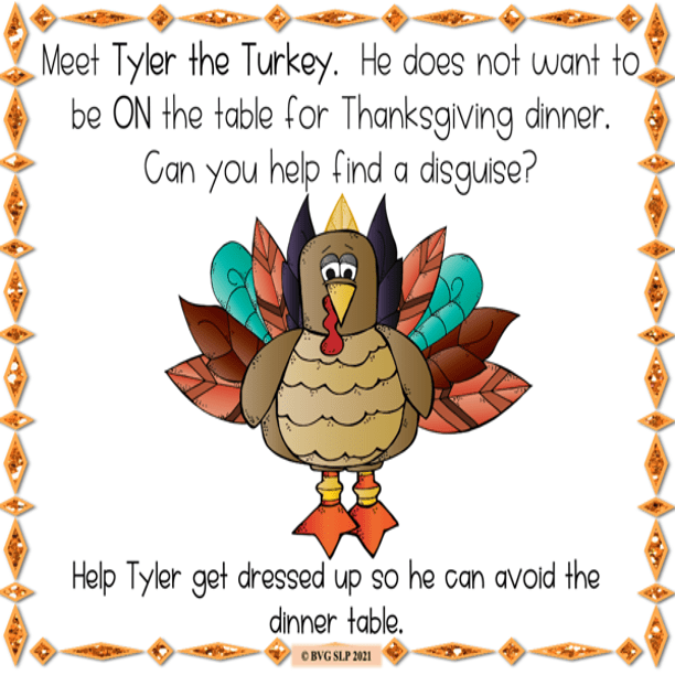 Have FUN WHILE LEARNING with this Thanksgiving Dress a Turkey Digital Boom Cards lesson. This is a comprehensive NO PREP Boom Cards Activity that addresses following directions, vocabulary, making inferences, describing, answering questions, comprehension and MORE in a fun, engaging way. It includes full-color images and it’s fully interactive. It also includes an open-ended section to allow students to identify the people and things that they are most thankful for. It’s excellent for encouraging an ATTITUDE OF GRATITUDE in your students.